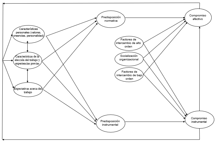 Resumen: El modelo de dos dimensiones del compromiso organizacional de Cohen (2007) propone que un empleado posee predisposición a generar compromiso al ingresar a una empresa y tiempo después se consolida el compromiso como actitud. Sin embargo, en dicho modelo el autor no profundiza en el desarrollo teórico de las variables que intervienen en el proceso. Por ello, en el presente trabajo se pretende complementar el sustento teórico de las variables incluidas en el modelo. Se realizó una revisión teórica que comprendió las variables incluidas en el modelo de dos dimensiones. La complementación teórica del presente trabajo proporciona el sustento a las variables incluidas en el modelo que explican el mecanismo que genera al compromiso organizacional en sus dimensiones afectiva e instrumental.