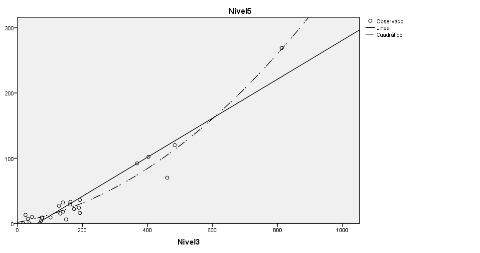 Los valores de la R2 en el caso de: i) la curva lineal es de 0.91 (P<0.01); ii) la curva cuadrática es de 0.963 (P<0.01). En consecuencia, el modelo que mejor explica esta relación es la relación cuadrática que tendría la siguiente expresión,