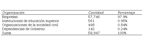 Se observa que, de las 13,204 empresas e instituciones de la muestra, la media por entidad federativa es de 481.38 organizaciones, con una gran dispersión dada la heterogeneidad de su establecimiento en los diferentes estados, expresado en el rango entre el valor máximo y mínimo y un alto coeficiente de variación CV de 2.52. Esta dispersión igualmente se ve reflejada en menor medida en el número de trabajadores, con una media de 252,961 por entidad federativa.