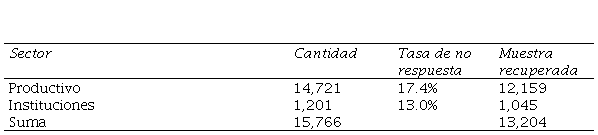 De este marco muestral se tomó una muestra de las empresas con un nivel de confianza del 95%; un error relativo del 9% y una tasa de no respuesta máxima del 20%, tal como se muestra en la Tabla 2.