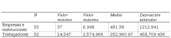 Los principales resultados descriptivos de las variables tomadas para el presente estudio para las 32 entidades federativas, se muestran en las siguientes tablas. En la tabla 3 se presentan los principales parámetros en la cantidad de empresas e instituciones y los trabajadores en ellas en las 32 entidades federativas.