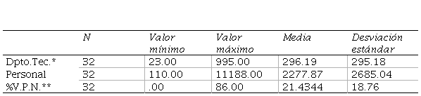 Se observa, por una parte, que la media de la existencia de departamentos técnicos 296.2 corresponde a 61.5 % de la media que es de 481.38 empresas e instituciones con más de 20 empleados de la muestra y por otra parte el número medio de personal es de 7.7 trabajadores en estos departamentos. Igualmente, se observa que sólo 21.43% de las ventas de estas empresas corresponden a productos nuevos.