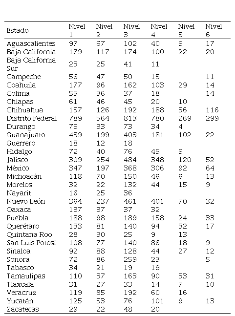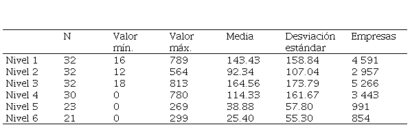 En cuanto al número de empresas e instituciones que poseen estos niveles en las 32 entidades federativas, se muestran los principales parámetros, como son, la media y la dispersión en la tabla 5.