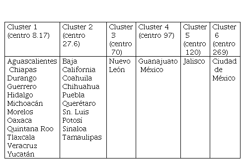 Por otra parte, dada la gran heterogeneidad de las diferentes regiones de México, los investigadores Valdez-Lafarga y León-Balderrama (2015), llevan a cabo una taxonomía de los sistemas de innovación seguidos por las 32 entidades federativas, con la técnica de conglomerados, en función de su similitud de las principales actividades (o dimensiones), de innovación, resultando la agrupación de seis Sistemas Regionales de Innovación, con grandes diferencias entre ellos[1].