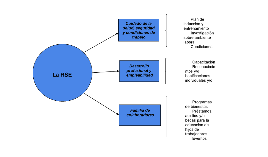 Considerando las prácticas que se llevan en la empresa en dónde se realizó este caso, se adaptó el modelo de los autores Peláez-León et al. (2014) se logró formular un esquema presentado en la Figura 1, partiendo de poder comprobar si resulta factible poder alcanzarse la RSE por parte de la empresa cumpliendo con los siguientes enfoques, orientándose en primer lugar en el desarrollo profesional y empleabilidad mediante la capacitación continua, otorgamiento de reconocimientos y/o bonificaciones individuales y/o colectivas por el desempeño de los trabajadores, la entrega de becas o auxilio y/o asistencia para la realización de estudios que permiten lograr la superación profesional, y en la segunda el cuidado de la salud, seguridad y condiciones de trabajo logrando cumplir con programas de inducción y entrenamiento, realizando investigaciones sobre el ambiente laboral, realizando supervisiones sobre las condiciones de trabajo para mejorar la calidad de vida laboral e implementando en zonas aledañas a las áreas de trabajo espacios de recreación de convivencias y agregando a manera de propuesta una tercera dimensión que proyecta un alcance que pueda llegar a tener la RSE en el ámbito familiar de los colaboradores, generando un balance trabajo-familia y como resultado una calidad de vida, realizando en la empresa programas de bienestar dirigidos a la salud, vivienda, deporte, recreación, préstamos, auxilios y/o becas para la educación de hijos de trabajadores, eventos festivos de integración con familiares de trabajadores como día del niño, navidad, así como eventos de reconocimiento al compromiso de los trabajadores en los cuales invitan a ser parte a los familiares, talleres de capacitación para cónyuges y/o hijos y jornadas de vacunación y salud para familias del trabajador.
