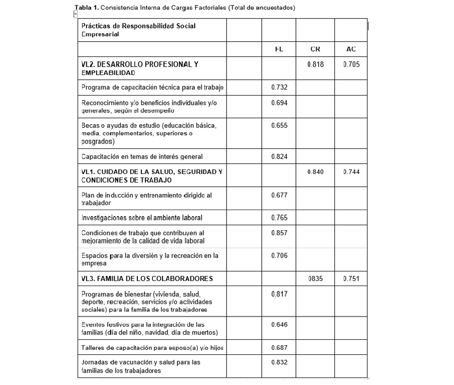 Para valorar la hipótesis en la relación de la adopción de la responsabilidad social empresarial con los resultados en el desarrollo profesional y un alcance en el ámbito familiar del trabajador del área de producción se realizó el análisis al total de la muestra que contemplaba 150 encuestas, permitiendo obtener las cargas factoriales de las variables observables.