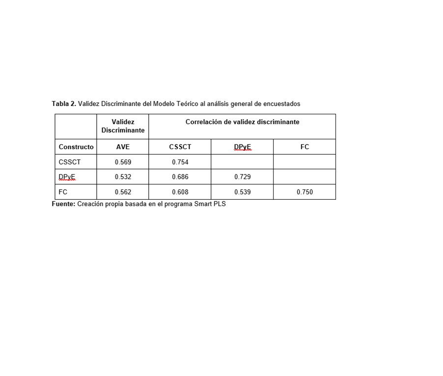Después de valorar los resultados referentes al modelo de medida, permitieron evaluar la validez de un modelo a través de la consistencia interna con el Alfa de Cronbach y la fiabilidad compuesta, se determinó la validez convergente (varianza media extraída AVE), la cual nos indica lo diferente qué son los constructos considerados utilizando la propuesta de Fornell y Larcker (1981) que señalan que un constructo estará alto de validez discriminante, cuando la AVE de cada constructo fueron aceptables, además en la correlación se lograron resultaron mayores al inferior y para cada caso igualmente superior con el del lado izquierdo