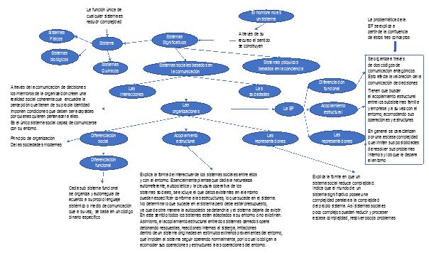 La propuesta teórica de luhmann se construye esencialmente a partir de los conceptos de sistema, autopoiésis, clausura operativa y auto/heterorreferencia. Así como de la diferenciación social, el acoplamiento estructural y la complejidad (representaciones). Apoyándonos en Luhmann (2012), empezaremos diciendo, que lo que un sistema es se define por su función. Existen múltiples tipos de sistemas, pero todos ellos tienen una única y misma función; que consiste en reducir complejidad. Dicho en otros términos, en resolver problemas del universo. Ampliando esta idea, se tiene, que en el universo operan ciertos procesos o mecanismos o fuerzas u operaciones que reducen complejidad, esto es, aminoran el desorden, reducen localmente el carácter contingente, indeterminado y problemático del universo. A estos procesos reductores de complejidad se les denomina sistemas.