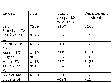 El desarrollo de las economías colaborativas es un fenómeno que se está observando en todo el mundo, para el caso de Airbnb, los que se benefician por el servicio de hospedaje son aquellos dueños de habitaciones alquiladas y los turistas que pagan un precio más bajo en comparación con la industria tradicional (Tesca?iu, Epuran, Tec?u, Chi?u y Mekinc, 2018). En la Tabla 1 se puede apreciar un comparativo de precios de renta entre los hoteles y la aplicación tecnológica en varias ciudades de Estados Unidos.