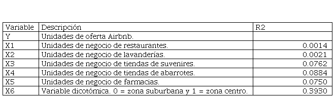 Cabe señalar que se utilizó el modelo de regresión lineal múltiple no para encontrar una causalidad, sino para identificar la correspondencia entre los alojamientos de la plataforma antes mencionada, con los establecimientos más próximos; dada la premisa que los turistas requieren de bienes y servicios de aquellos negocios que se encuentran más próximos a su centro de hospedaje.