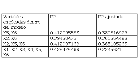 Asimismo, se calcularon los coeficientes de determinación R2 de cada modelo construido, así como el R2 ajustado, resultando en lo descrito por la Tabla 4.