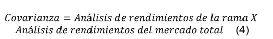 Adicionalmente al cálculo de la Varianza del mercado de micro empresas y, con base en el análisis de los rendimientos del Índice del mercado de micro empresas (Tabla 3) y al análisis de los rendimientos de las ramas elegidas de los subsectores de la construcción (Tabla 4), es posible determinar la Covarianza[8] entre ambos para cada año de análisis. Dicha estimación se muestra en la Ecuación 4 y requiere multiplicar cada uno de los rendimientos estimados de las ramas elegidas por los rendimientos calculados del mercado total para el mismo periodo, el paso final consiste en realizar la suma de dichos resultados, obteniendo así la covarianza de los mismos.