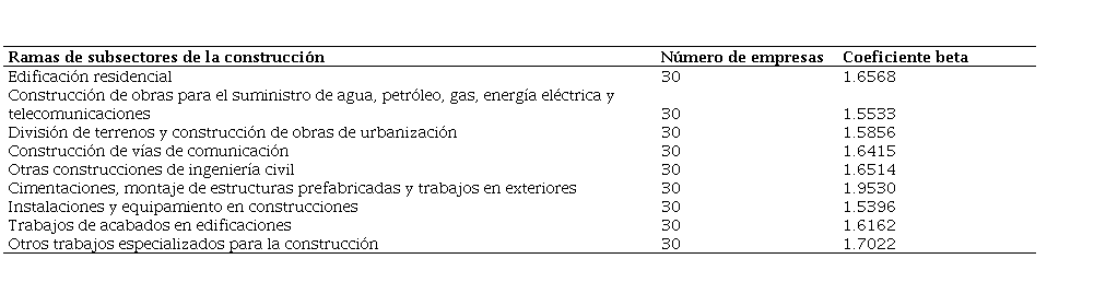 4.4. Cálculo de los coeficientes de riesgo beta para las ramas del sector de la construcción seleccionadas.