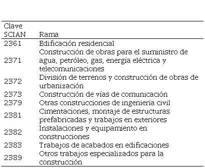 3. Pertenecientes a las ramas de los subsectores de la construcción en México descritos en la Tabla 2.