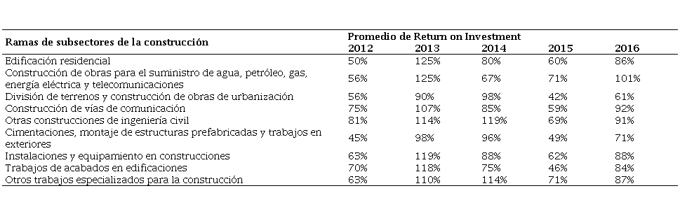 De manera similar, la Tabla 4 exhibe los datos de la rentabilidad media anual medida por medio del ROI para las ramas de los subsectores de la construcción señaladas y para el mismo periodo de evaluación.