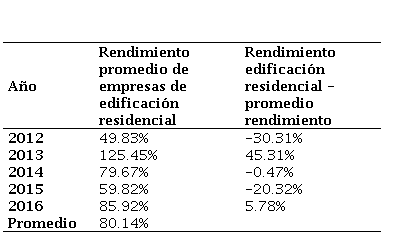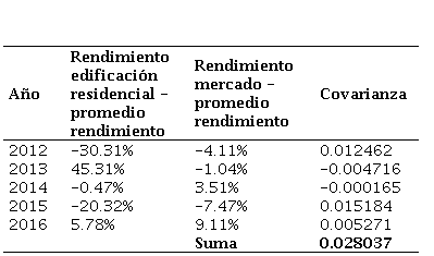 Una vez que se calculan la totalidad de las operaciones respectivas a cada uno de los cinco años de evaluación, es posible determinar los resultados que se muestran en la Tabla 5. Las estimaciones mostradas para la rama de edificación residencial se realizan de la misma manera para el resto de las ramas de los subsectores de la construcción seleccionadas. Los datos obtenidos se utilizarán posteriormente para calcular la covarianza que existe entre los rendimientos de las ramas de los subsectores de la construcción seleccionados y el rendimiento del mercado total de micro empresas en el país.