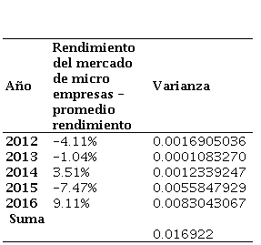 El coeficiente de riesgo beta requiere para su obtención de la estimación de la Varianza[7] referente a los rendimientos del mercado de micro empresas para el periodo de evaluación (Tabla 3). Para ello, se utilizan los datos obtenidos del rendimiento del mercado total para cada año y se resta su promedio para posteriormente elevar al cuadrado el resultado correspondiente de cada periodo, tal como se muestra en la Ecuación 3.