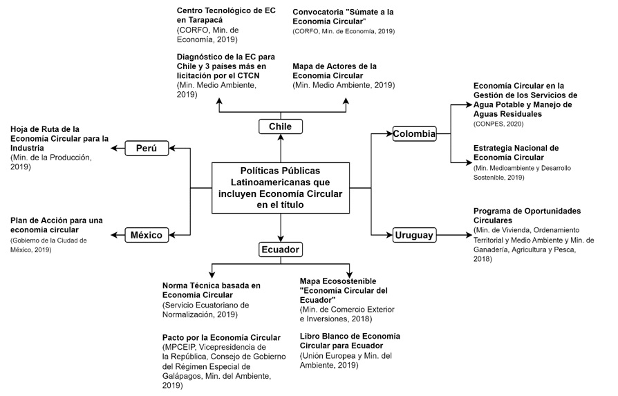 La Figura 1 muestra a continuación algunos de los lineamientos en materia de política pública de países de Latinoamérica que incorporan a la economía circular como componente central.