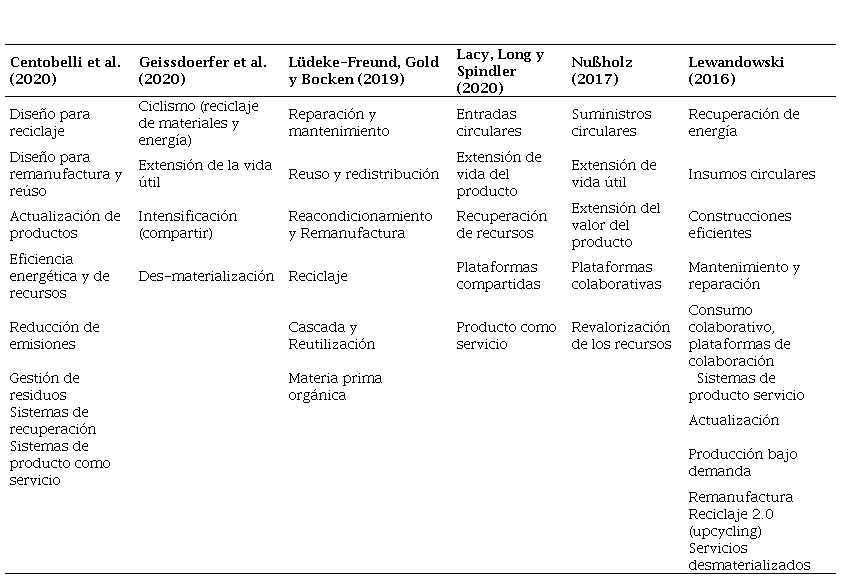 Al observar las propuestas previas por parte de diversos autores, éstas pueden sintetizarse y agruparse seis grupos: 1) la extensión de la vida útil de los productos; 2) la proveeduría circular, 3) la recuperación de recursos, 4) las plataformas colaborativas, 5) los modelos de productos como servicios y, 6) la categoría que trabaja con materias primas y materiales orgánicos. Cada una de estas categorías alberga diversas modelos que comparten algunas características entre sí.