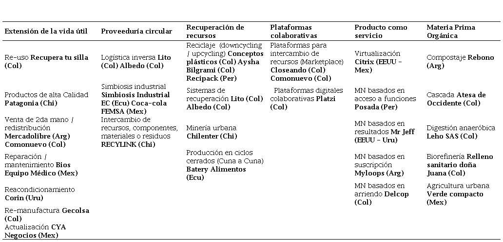 En función del objetivo de investigación se identificaron algunos ejemplos de empresas de países en Latinoamérica con modelos de negocio circulares que corresponden a alguna de las categorías identificadas en la literatura, la Tabla 2 muestra dicha relación. En el Anexo 1 el lector podrá encontrar el listado de empresas clasificadas por categoría de modelo de negocio circular.