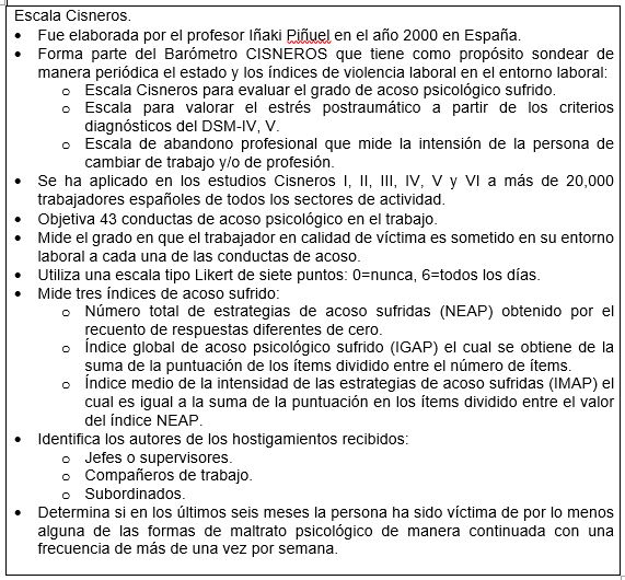 De acuerdo con Piñuel y Oñate (2006) el acoso psicológico directo recibido por los trabajadores se presenta principalmente en los sectores sanitarios, servicios subcontratados y el sector educativo. La Escala Cisneros tiene la ventaja de medir y objetivar 43 conductas de acoso psicológico a las que están expuestos las víctimas en las organizaciones.