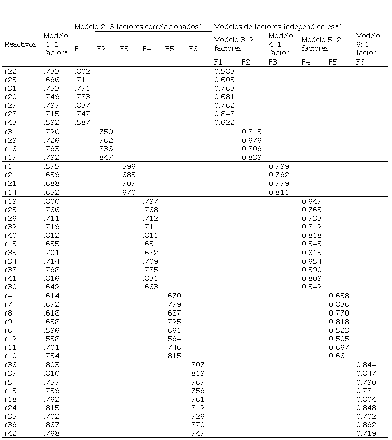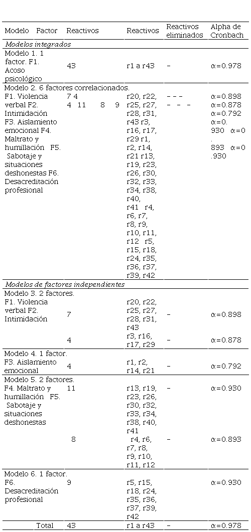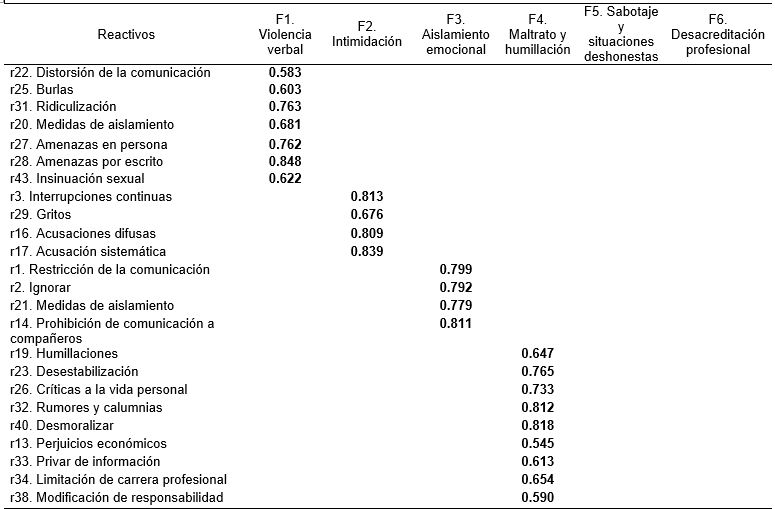 a) Se realizó un análisis de contenido de los reactivos (43 conductas de acoso) de la Escala Cisneros y se integraron en seis factores (Tabla 3). El análisis de contenido se efectuó con tres expertos en psicología organizacional y psicometría. Este análisis permitió agrupar las 43 conductas de acoso en seis factores. Para este fin se consideró la definición de acoso psicológico de Piñuel y Oñate (2006). También, este análisis permitió corregir tres reactivos para utilizar el lenguaje utilizado en población de habla hispana en el contexto latinoamericano. Los reactivos corregidos fueron tres: reactivo 23 ‘Intentan provocarme para hacerme explotar’, reactivo 29 ´Me gritan o elevan la voz para intimidarme´, y reactivo 42 ‘Controlan aspectos de mi trabajo de forma malintencionada para intentar encontrarme un fallo’.