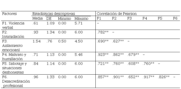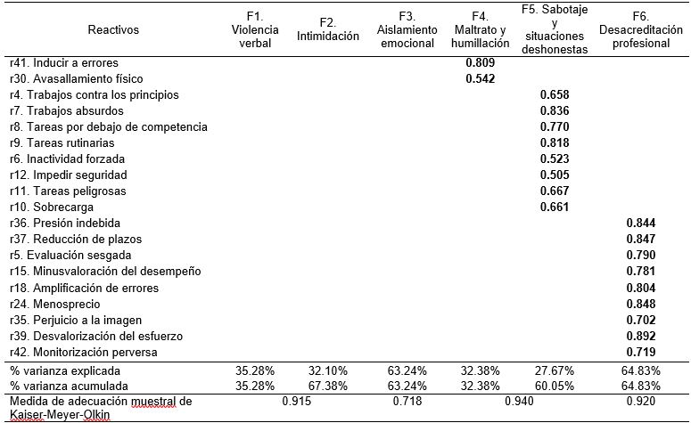 En la validez factorial de la Escala Cisneros de Fidalgo y Piñuel (2004) se validaron 6 factores. El F1 Violencia verbal y el F2 Intimidación se validaron con 7 y 4 reactivos respectivamente, obteniendo una varianza explicada acumulada del 67.38%. El F3 Aislamiento emocional se validó con 4 reactivos y una varianza explicada del 63.24%. El F4 Maltrato y humillación se validó con 11 reactivos y el F5 Sabotaje y situaciones deshonestas con 8 reactivos. Estos dos factores presentaron una varianza explicada acumulada del 60.05%. El F6 Desacreditación profesional se validó con 9 reactivos, presentando una varianza explicada del 64.83%. En la Tabla 4 se reportan los resultados de la medida de adecuación muestral de Kaiser-Meyer-Olkin y de la Prueba de esfericidad de Bartlet. Los resultados indican que el análisis factorial fue adecuado.