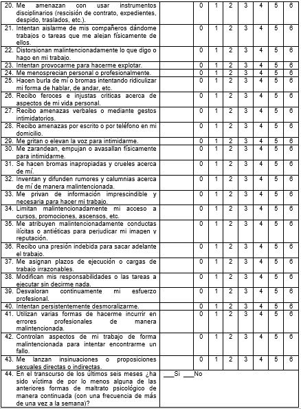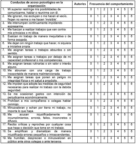 También existen otras escalas para medir el acoso psicológico en la organización tales como el Leymann Inventory of Psychological Terrorization (LIPT) elaborado en Suecia por Leymann (1990), el Luxembourg Workplace Mobbing Scale de Steffgen, Sischka, Schmidt, Hohl y Happ (2019), la Escala de Abuso Psicológico en el lugar de Trabajo (EAPA-T) de Escartín, Rodríguez-Caballeira, Gómez-Benito y Zapf (2010). En población de habla hispana existen escalas tales como el Cuestionario de Acoso Psicológico Percibido de Morán (2007), el Inventario de Violencia y Acoso Psicológico en el Trabajo (IVAPT-PANDO) de Pando, Aranda, Preciado, Franco y Salazar (2006), la Escala de Violencia en el Trabajo (Mobbing) de Uribe (2013). Sin embargo, en estas dos últimas escalas no se aclara cuáles factores miden violencia laboral y cuáles miden acoso psicológico.