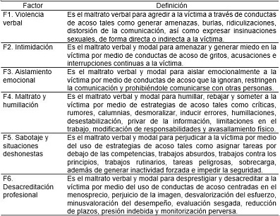 b) Se definieron los seis factores, considerando las conductas de acoso psicológico de cada factor y la definición de acoso psicológico o mobbing en la organización de Fidalgo y Piñuel (2004).