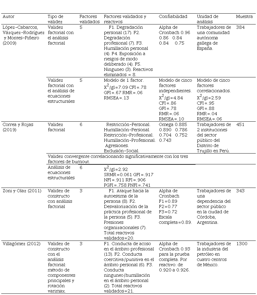 La Escala Cisneros en su edición original no presenta una validez factorial y no reporta resultados de confiabilidad, más bien está enfocada a identificar, medir y objetivar 43 conductas de acoso psicológico. Sin embargo, en la literatura existen escasas investigaciones en las que se ha validado la Escala Cisneros (Tabla 1). López-Cabarcos, Vázquez-Rodríguez y Montes-Piñeiro (2009) validaron la Escala Cisneros en gallego, identificando cinco factores que explican el 60.3% de la varianza total y tienen un Alpha de Cronbach de 0.96. De acuerdo con estos factores se eliminaros 4 factores porque presentaron bajos porcentajes de varianza explicada dando un total de ocho reactivos eliminados.