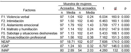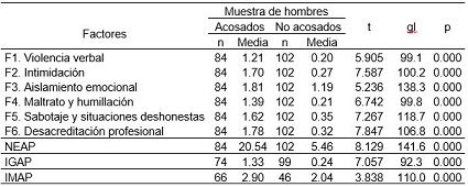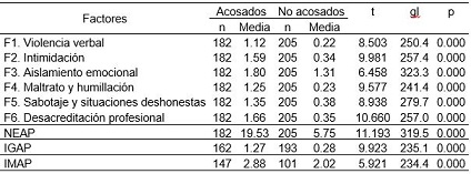 e) La validez predictiva se estimó obteniendo diferencias significativas de los seis factores validados entre acosados y no acosados utilizando el análisis t-student. Así también, se identificaron diferencias significativas entre mujeres acosadas y no acosadas y entre hombres acosados y no acosados. Cabe señalar que la validez predictiva se determina estableciendo un criterio que permite identificar un resultado como es el caso de haber sido acosado o no (Hernández, Fernández y Baptista 2010). Entonces, para validar el instrumento se deberían obtener puntajes más altos de acoso psicológico en quienes han sido acosados, comparativamente con quienes refieren no haber sido acosados.