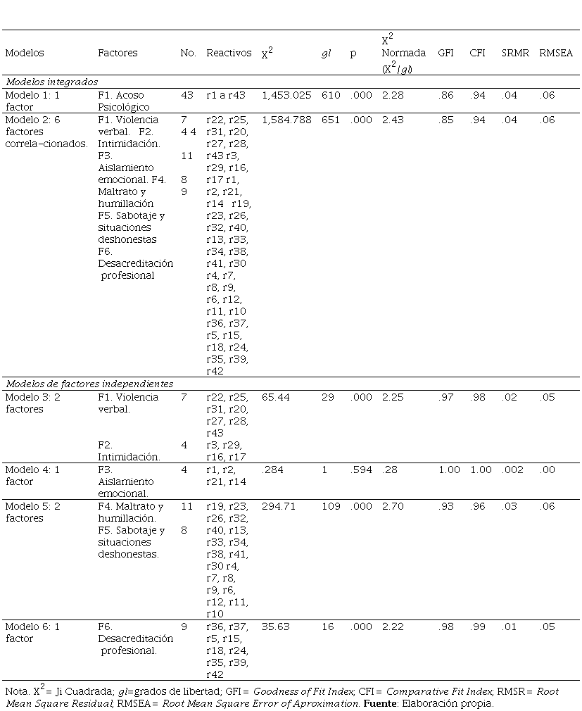 En esta investigación los resultados indican que la Escala Cisneros esta validada y permite medir un solo factor referente al acoso psicológico o seis factores de acoso psicológico correlacionados.