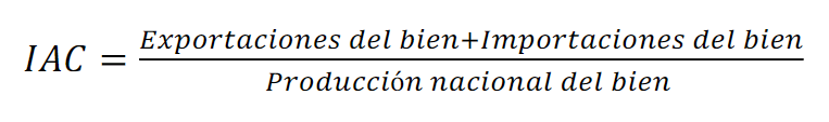 El IAC indica el comportamiento de las importaciones y exportaciones sobre la producción nacional, es decir, la dinámica del intercambio comercial del país. Es también una medida que representa la autosuficiencia del país en un bien determinado y su capacidad para abastecer y competir en los mercados internacionales. Su cálculo se realiza mediante la ecuación 2 (Ireta, et al. 2015).
