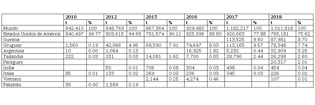 Durante el periodo, Estados Unidos permaneció como el principal origen de las importaciones mexicanas de arroz, teniendo participaciones superiores al 90% entre 2010 y 2015. Para el 2018, Estados Unidos fue el proveedor de más del 75% de las importaciones mexicanas de arroz, seguido por Guyana, Uruguay y Argentina. Llama la atención que México, en el periodo mencionado, importó arroz desde países tan distantes como Pakistán, Vietnam, la India y Tailandia (ITC, 2022).