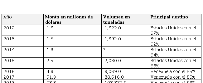 En seis de los años considerados estas exportaciones se concentraron en el mercado de los Estados Unidos, país que adquirió casi el total de las exportaciones de arroz de México del 2012 al 2015. También, llama la atención la importancia de las exportaciones a Venezuela en los años 2016 a 2019, alcanzando sus cifras más elevadas en 2017 y 2018.