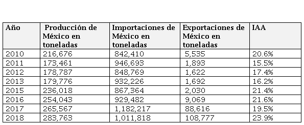 Se calculó el IAA para el caso de México en arroz para los años que aparecen en la tabla 5, lo anterior por la disponibilidad de información. Como puede apreciarse el IAA mostró valores bajos durante todo el periodo estudiado. Los valores del indicador se ubicaron en un rango entre el 15.5 y el 23.9%, es decir, México mostró una baja capacidad para satisfacer de manera autónoma sus necesidades de este cultivo, en promedio sólo el 19.5%.