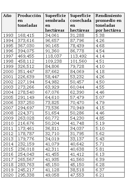 El rendimiento por hectárea muestra cifras contrastantes en las distintas zonas del país. En el año 2020, el mayor rendimiento obtenido se ubicó en el municipio de Tierra Blanca, Veracruz con 12.3 t/ha. Le siguieron en importancia, Tlalixcoyan, Veracruz con 12 t/ha, y los municipios de Cuernavaca, Ayala y Cuautla, del estado de Morelos, con 10.6, 10.5 y 10.4 t/ha respectivamente. Cabe mencionar que todos estos rendimientos fueron obtenidos utilizando sistemas de riego. En el mismo año, el rendimiento más bajo utilizando riego se identificó en el municipio de Hopelchén, Campeche con sólo 3.1 t/ha. Por otro lado, los rendimientos fueron considerablemente menores en las zonas desprovistas de riego. El rendimiento por hectárea más alto obtenido sin riego en 2020 ocurrió en Xalisco, Nayarit con 6.4 t/ha, a este le siguieron Coquimatlán, Colima con 5.6 t/ha y Otatitlán, Veracruz con 5.2 t/ha (SIAP, 2022).