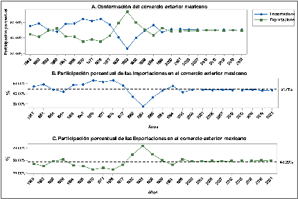 La parte B de la Imagen 1, presenta de manera aislada la participación de las importaciones respecto al comercio exterior total, mientras que la parte C de la misma imagen integra la participación de la exportación. En ambos casos se añadió una línea punteada que representa la media aritmética de la participación en cada caso, observando que a partir del año 2000 y hasta el 2021 existen incipientes cambios.