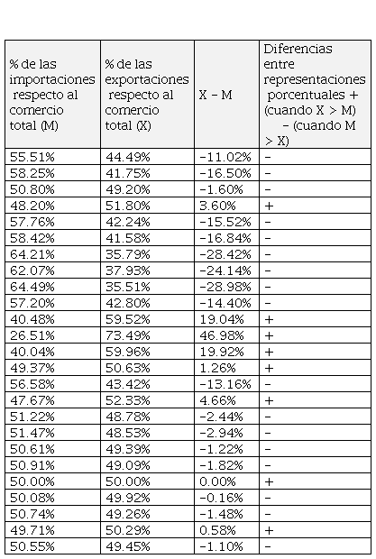 La Tabla 1 también permite establecer el rango de la conformación del comercio, siendo que el porcentaje mínimo de las importaciones con respecto al comercio total fue de 26.51% durante el gobierno de Miguel de la Madrid Hurtado, mientras que el mayor porcentaje fue de 64.49% durante la gestión de Luis Echeverría Álvarez. Considerando lo anterior, el mayor porcentaje de las exportaciones aconteció con Miguel de la Madrid Hurtado con 73.49% mientras que el menor porcentaje se registró con Luis Echeverría Álvarez con 35.51%.