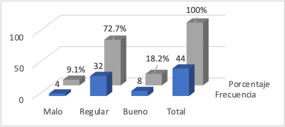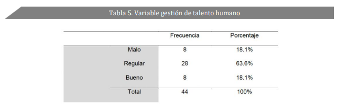 En la tabla 5 y figura 2 se establece la valoración porcentual de la variable gestión de talento humano, donde el 63.6% (28 encuestados) refiere que presenta un regular nivel y el 18.1% indica un nivel bueno.