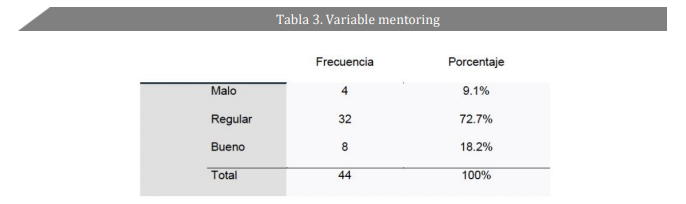 En cuanto al análisis porcentual de la variable mentoring, se puede observar en la tabla 3 y figura 1 que el 72.7% de encuestados (es decir, 32 encuestados) señalaron que el mentoring en el Gobierno local de Sullana se encuentra en una valoración de nivel regular, en contraste con el 18.2% (8 encuestados) que expresó que tiene un nivel bueno.