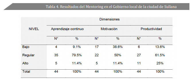 Al determinar la relación significativa entre el mentoring y la gestión de talento humano en el Gobierno local de la ciudad de Sullana, se pudo encontrar en el análisis descriptivo que el 72.7% del total de los encuestados se encuentra en un nivel de mentoring regular. De este modo, el 63.6% de los encuestados se encuentra en un nivel de gestión de talento humano regular. Además, en el análisis inferencial del estudio se evidencia un índice de significancia de 0.001 y un nivel de relación altamente positivo de 0.858 entre las variables. En tal sentido, Moreno (2019), analizando las mismas variables en una universidad pública en la ciudad de Andahuaylas (Apurímac), determinó una correlación positivamente alta de 0.797 entre el mentoring y la gestión de talento humano. Asimismo, Días & Toscano (2022) reafirma la importancia de potencializar las capacidades de los colaboradores a través de programas que permitan un desarrollo personal y organizacional. Igualmente, Cahuas (2019) encontró una alta correlación de 0.744, de tal manera, muestra que el proceso de mentoring contribuye al aprendizaje continuo. Además, Arana (2018) manifiesta que la gestión del talento humano influye en el desempeño laboral de los funcionarios, mediante procesos de formación que permitan desarrollar sus capacidades. Por otro lado, Carreño & Torres (2022) coinciden con los resultados descriptivos tomando en cuenta que un 65.3% de la gestión del talento humano se encuentra en el nivel medio. El mentoring conlleva a grandes beneficios, como potenciar las capacidades profesionales o personales permitiendo aumentar la relación de confianza entre jefes y colaboradores mejorando la cultura organizacional (Pendino, 2022).