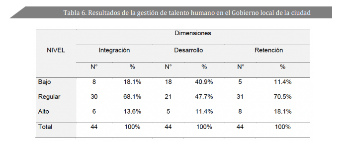 En la tabla 6 se percibe que el 68.1% de los encuestados (30) indica que la dimensión integración presenta un comportamiento regular, mientras que el 18.1% señala que tiene un nivel bajo. En cuanto a la dimensión desarrollo, el 47.7% (21 colaboradores encuestados) refiere que se ha desarrollado en un nivel regular, ante un 40.9% que indica que su nivel de desarrollo ha sido bajo. Y en la dimensión retención, el 70.5% de los encuestados señalan un valor de nivel regular.