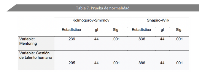 En la tabla 7 se observa que la muestra obtenida para este caso fue de 44 encuestas, además, se puede observar que la distribución de la información de las encuestas no es normal, ya que el valor de significancia es menor a 0.05, es decir 5%.