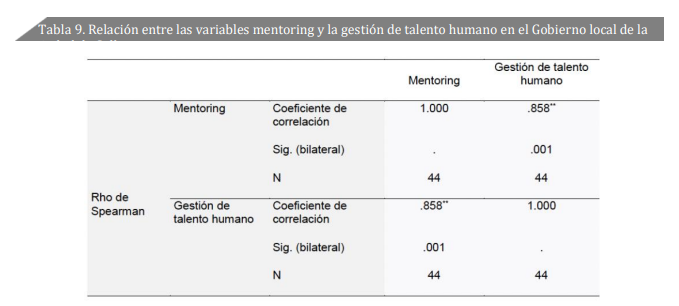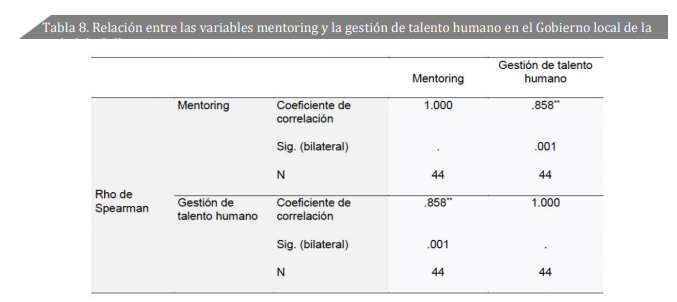 En el Perú, el talento humano es considerado esencial en la gestión municipal, dado que la correcta representación a la población resultará del desarrollo de habilidades y capacidades de sus funcionarios. Según INEI (2023), existe un total de 196 municipalidades provinciales, las cuales en su mayoría presentan deficiencias notables en su administración, en cuanto a las funciones de sus cargos, debido a la falta de liderazgo y escasa formación que impide responder a las necesidades de la población (López et al., 2021). Una de las herramientas que asegura su desarrollo es, precisamente, el programa de mentoring (Froy et al., 2022). SegúnCasero (2018), a través del mentoring se logran trasmitir conocimientos y experiencias para que el talento humano pueda desarrollarse con éxito, tanto a nivel personal como profesional (Lozano et al., 2020). Moreno (2019) encontró una correlación positiva y alta de 0.797 entre el mentoring y la gestión de talento humano, reafirmando la importancia de poner en práctica y aplicar el mentoring para que el desarrollo del talento humano contribuya al beneficio de la institución pública y a todo el personal. Asimismo, Cahuas (2019) halló una alta correlación directa de 0.744, concluyendo que el proceso de mentoring se caracteriza por contribuir a un aprendizaje continuo. Mientras que Carreño & Torres (2022) resaltan la existencia de una relación altamente positiva de 0.817 entre la gestión del talento humano y la motivación en el Gobierno local de Sullana, considerando lo oportuno que es alentar y reconocer a los trabajadores del Gobierno local constantemente, ya que esto permitirá un nivel de motivación mayor en cada área de trabajo y mayores beneficios. Finalmente, Torre (2022) investigó la conexión entre gestión de talento humano y la productividad, mostrando a través de la prueba Rho de Spearman que existe una correlación buena y alta de 0.760. Por esta razón, los estudios suponen que la gestión del talento humano está asociada con la productividad