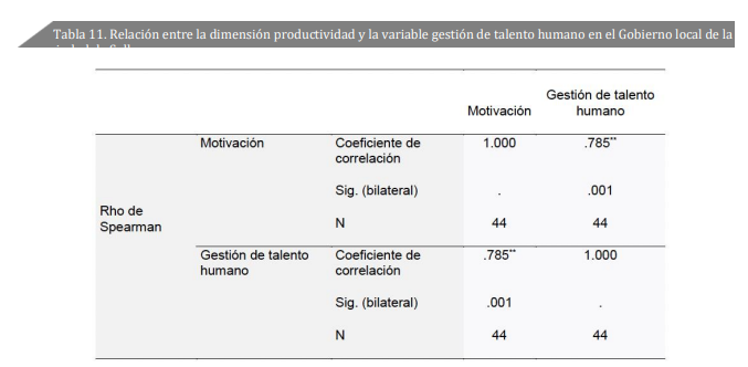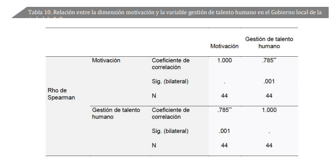 En la tabla 10 se puede observar una significancia bilateral de 0.001; al ser menor a 0.05, da validez a la hipótesis debido a que tienen relación, esto indica que la motivación sí se relaciona significativamente con la gestión de talento humano en el Gobierno local de Sullana. Igualmente, se consideró un coeficiente de correlación positivo alto de 0.785.