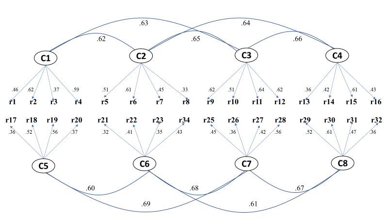 La Tabla 2 muestra los valores de parámetros que midieron las relaciones entre los indicadores con respecto a los factores. Se aprecia que están en el umbral esperado, corroborando la hipótesis de fiabilidad, la cual indica que convergerán los ítems en una subescala si estos miden rasgos de un concepto que los encuestados asimilan como tal y no lo confunden con otro rasgo de otro concepto. Por consiguiente, el instrumento puede ser empleado en otros contextos, escenarios y muestras midiendo los rasgos de un modo consistente. En el caso de la medición del uso de Internet, estos valores sugieren que la muestra encuestada distingue, cuando menos, ocho factores que explicarían los motivos y la necesidad de obtener información relativa a la pandemia.