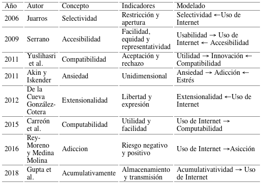 Los estudios psicológicos de crecimiento de las TIC consideran como exógeno económico y tecnológico al que determina las variables endógenas cognitivas y conductuales. Es decir, para acceder a las TIC, las organizaciones implementan programas de formación y capacitación entre los empleados para potenciar su desempeño a través de sus percepciones, actitudes e intenciones. Por lo tanto, la literatura muestra la prevalencia de ocho factores: 1) selectividad (Cassany & Hernández, 2012), 2) compatibilidad (García Alonso, 2007), 3) computabilidad (Morales-Luna, 2011), 4) accesibilidad (Peraza et al., 2017), 5) extensión (Pifarré, 2013), 6) acumulación (Colle, 2013), 7) ansiedad (Cañón Buitrago et al., 2016) y 8) adicción (Sánchez-Carbonell et al., 2008), que han sido confirmados en estudios, actualizado y especificado en la materia, aunque esta última parece evidenciar más una externalización que una internalización de patologías (King, 2016). La revisión y discusión de este estado del arte permitió modelar sus relaciones como una contribución central a la disciplina (ver Tabla 1).