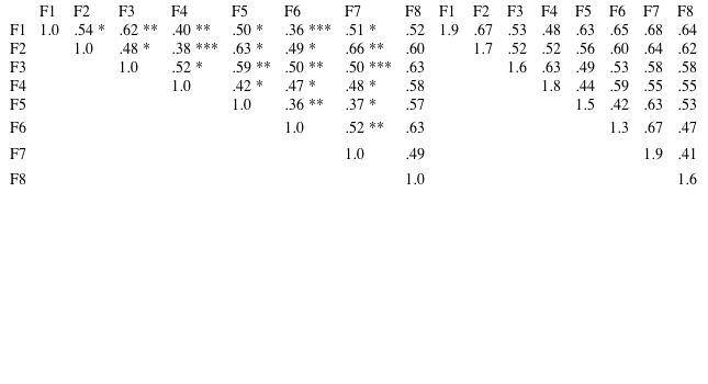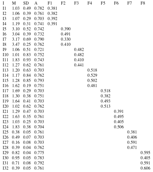 Para medir la consistencia interna se calculó el Alfa de Cronbach. Valores mayores de 0.6 dan cuenta de un buen indicador en este aspecto. En el caso de la validez de constructo se utilizó la correlación entre el ítem y el factor. Valores entre 0.3 y 0.9 son generalmente aceptados, ya que valores inferiores suponen la incidencia de otros factores en el ítem y los valores superiores al umbral se identifican como colineales. En el caso de correlaciones, los valores cercanos a cero se asumieron como evidencia de relación nula y los próximos a la unidad tanto negativa como positiva fueron contabilizados como evidencia de colinealidad. Respecto a las covarianzas, valores cercanos a cero fueron asumidos como evidencia de un factor común y los aproximados a la unidad como influencia unilateral de un factor común. En cuanto a los parámetros de ajuste, el nivel de significancia de ji al cuadrado permite comparar la estructura factorial del modelo teórico con la estructura factorial de los datos. Para los índices de bondad de ajuste como el GFI y el SRMR, valores por encima de 0.9 y por debajo de 0.08, respectivamente, son adecuados; al igual que χ2 / g.l < 3 (Hu & Bentler, 1999; McClintock, Lau y Miller, 2016).