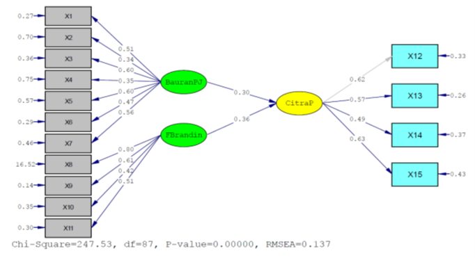 In Figure 2, the coefficient of the influence of the Services Marketing Mix (named BauranPJ) on Tourism Destination Image (named CitraP) is 0.298 (approximately 0.30), and that of Place Branding (named Fbrandin) on Tourism Destination Image is 0.356 (approximately 0.36).